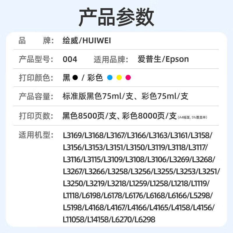 绘威适用爱普生004墨水L3251 L3258 L3255 L3153 L1258 L3118 L3158 3151 3156 3119 3256 epson打印机墨水 四色